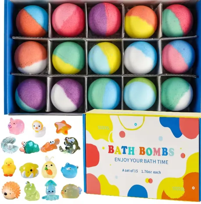 Make bath time magical with this 15-Pack Kids Bath Bomb Set featuring fun surprise toys hidden inside each fizzy bomb! Made with natural ingredients like baking soda, these bath bombs are gentle on young skin while filling the tub with vibrant colors, bubbles, and joy.